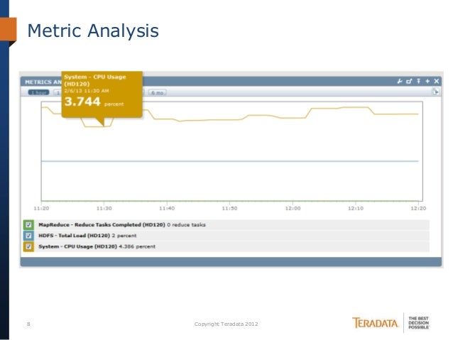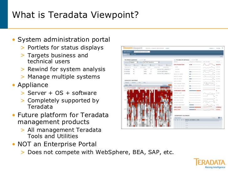 Teradata viewpoint is teradata's strategic and innovative sov (single operational view) for teradata db, aster, and hdp hadoop systems management and monitoring that enables teradata's unified.